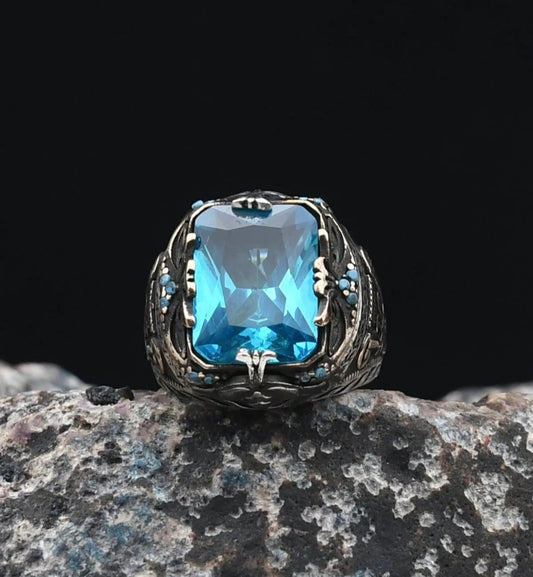 Aquamarine Stone Embroidered 925 Sterling Silver Ring
