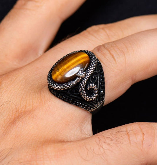 Tiger's Eye Stone Snake 925 Sterling Silver Ring